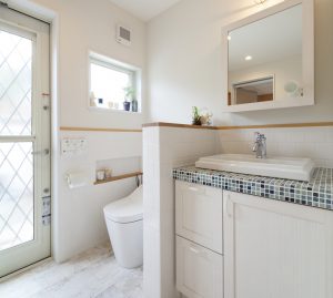 洗面室はトイレとつながっており、洗面台はタイルを取り入れるなど爽やかでおしゃれな空間。